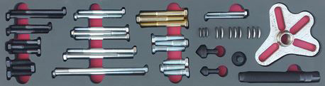 Includes a four-position two- and three-way yoke, three different pressure screw tips, and an assortment of SAE and metric bolts in a storage case