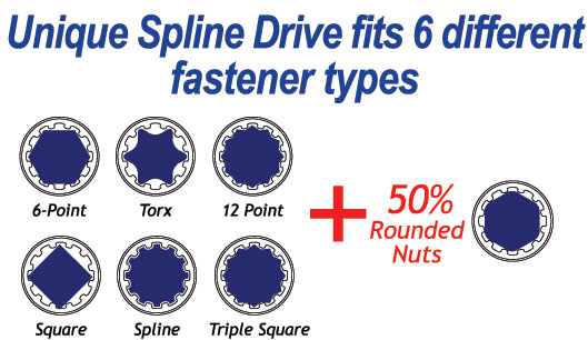 Unique Spline Drive fits 6 difference fasterner types